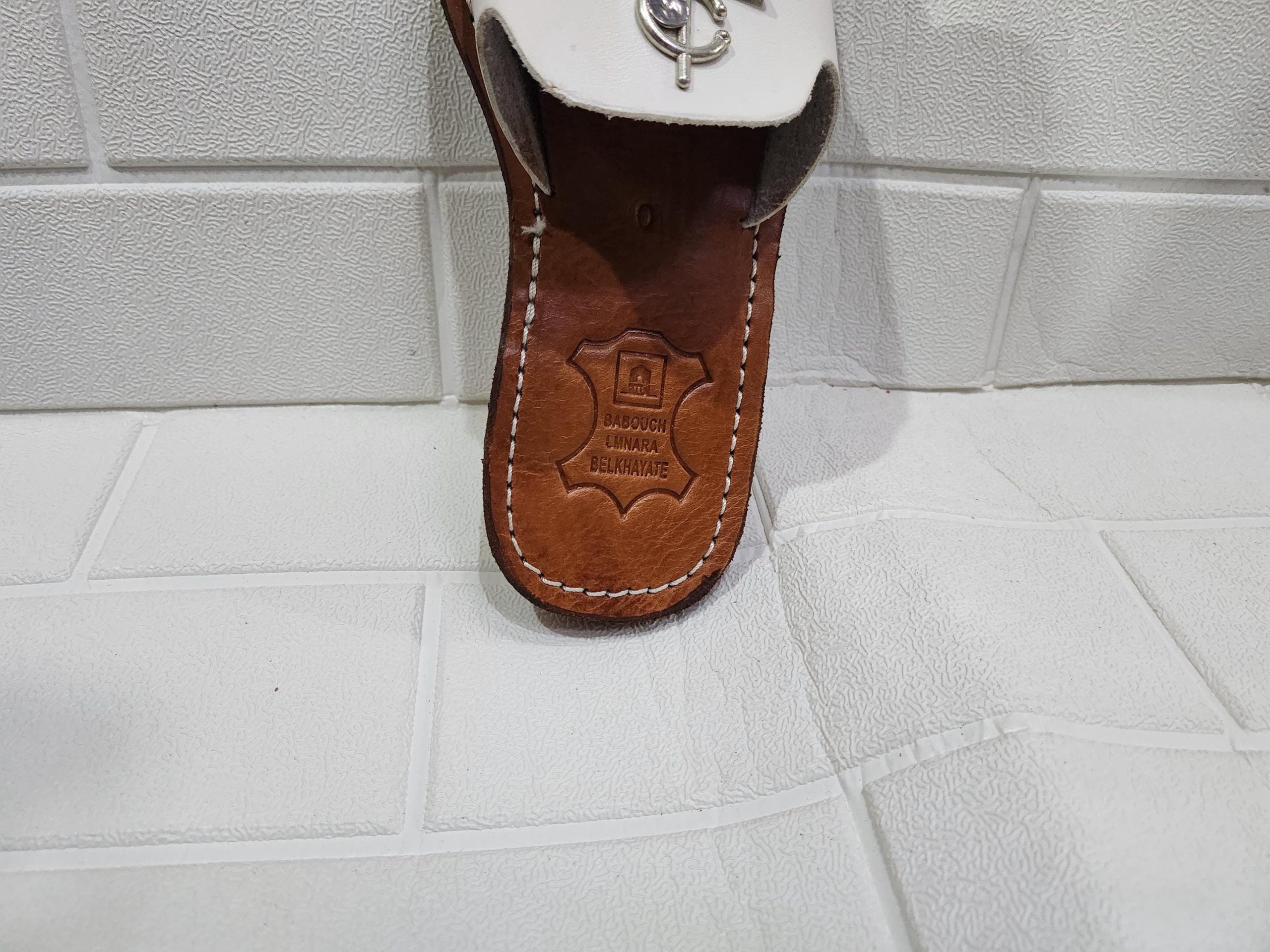 Handmade Moroccan White Leather Sandals – Silver Triangle Decor – Boho Flat Slippers For Women – Comfortable Ethnic Summer Slides – Ar